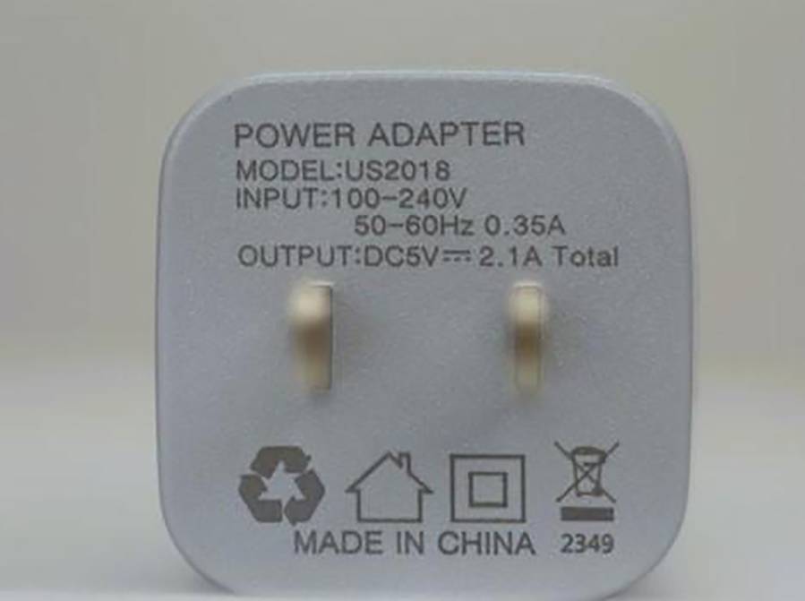 Il s’agit d’un bloc adaptateur d’alimentation USB à double port 2,1 A/5V de couleur blanche avec une bande grise. Le numéro de modèle US2018 se trouve du côté des broches de l’adaptateur. Les produits ont été vendus en paquets de cinq ou en paquets de deux sur Amazon.ca et peuvent être identifiés par les numéros d’identification standards d’Amazon (ASIN) B083LBZX1F et B082XPSDFL.