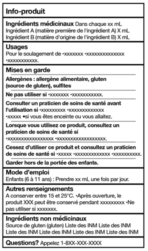 C’est ici que peuvent figurer les renseignements sur l’entreposage, l’emmagasinage ou d’autres instructions particulières. Ex. : « Réfrigérer après l’ouverture » ou « Utiliser dans les 24 heures suivant la dilution ».