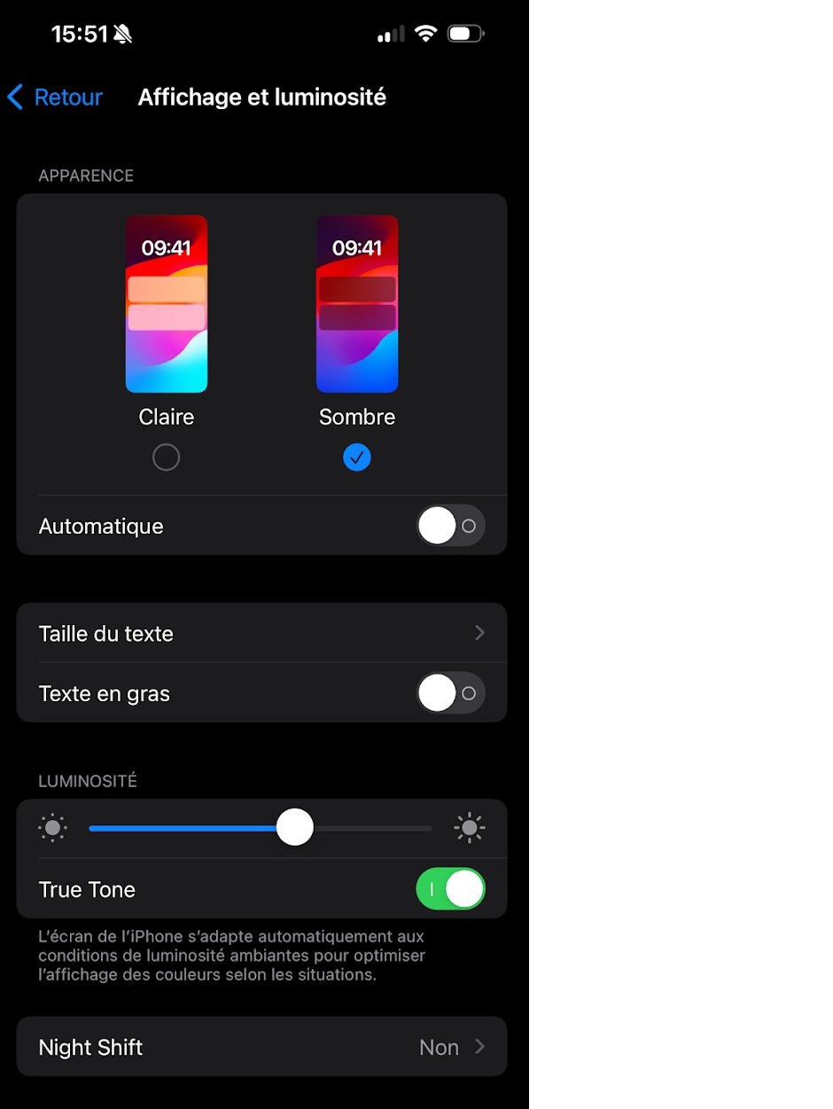 La plupart des téléphones récents sont dotés d’un mode sombre, qui affiche les applications sur un fond noir. Outre le fait qu’il rend l’écran plus agréable pour les yeux en soirée, ce mode permet aussi de réduire la consommation énergétique de certains types d’écrans, notamment ceux à diodes électroluminescentes organiques (DELO, ou OLED en anglais) qui équipent la majorité des appareils haut de gamme depuis quelques années. Cette fonction ne change rien, toutefois, à « l’appétit » des écrans ACL, ou à affichage à cristaux liquides (comme ceux de tous les modèles d’Apple vendus avant l’iPhone X).