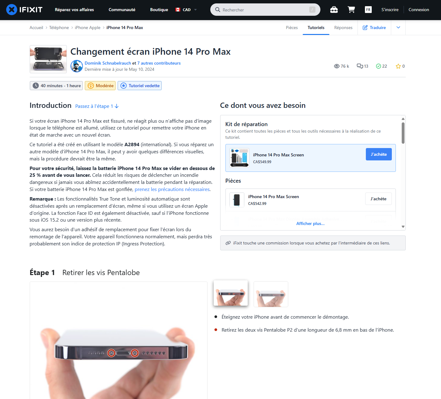 S’il est généralement plus économique de faire les réparations soi-même, passer par le fabricant directement se révèle parfois plus avantageux. L’écran d’un iPhone 14 Pro Max coûte par exemple 549 $ du côté d’iFixit, mais il faut payer 499 $ pour le faire remplacer dans les magasins Apple.